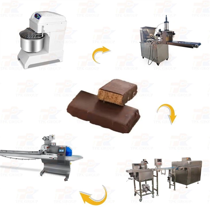 Тази производствена линия за протеинови блокчета, включваща миксер за тесто, машина за производство на протеинови блокчета, шоколадово покритие, машина за охлаждане и опаковане